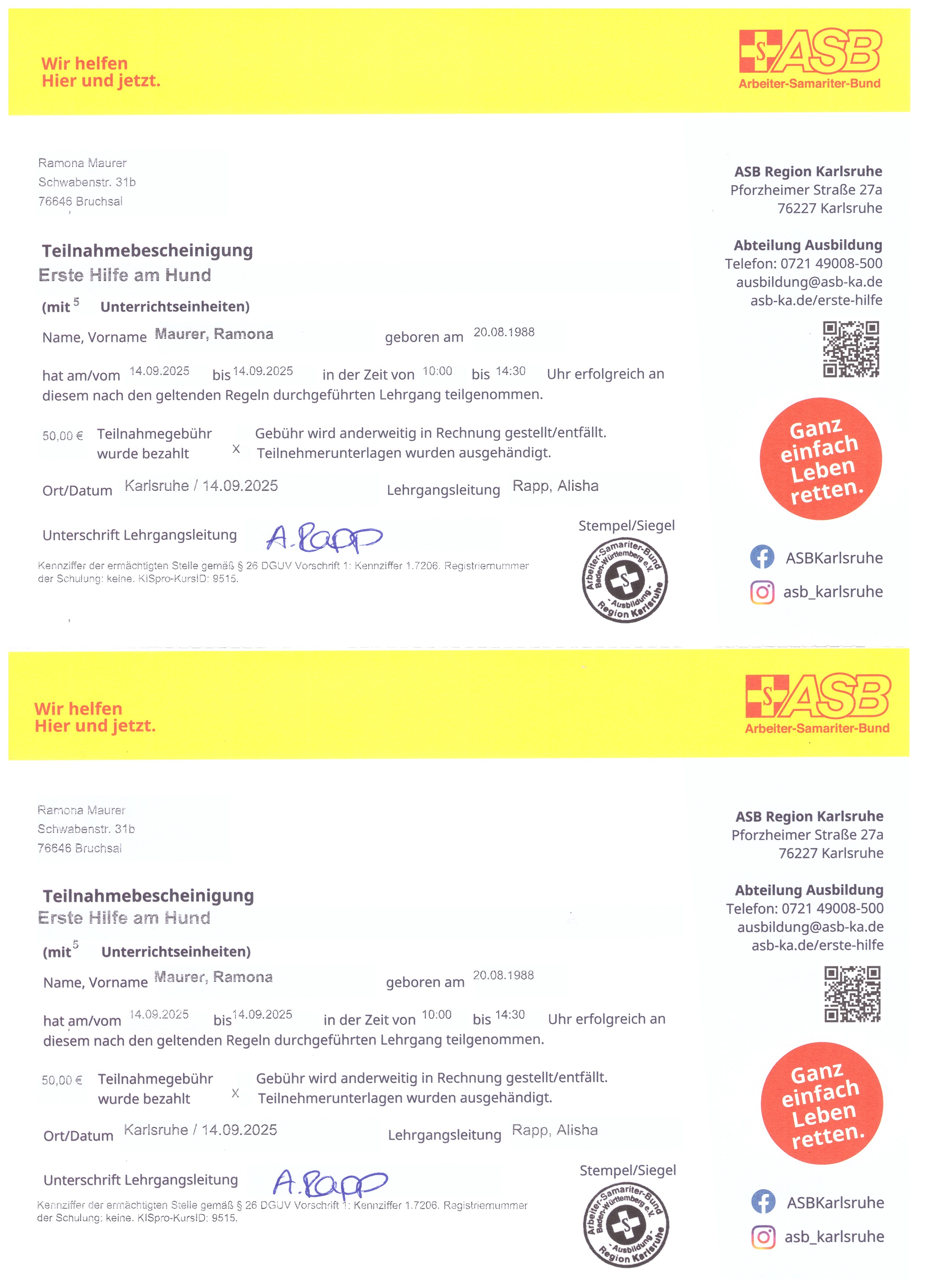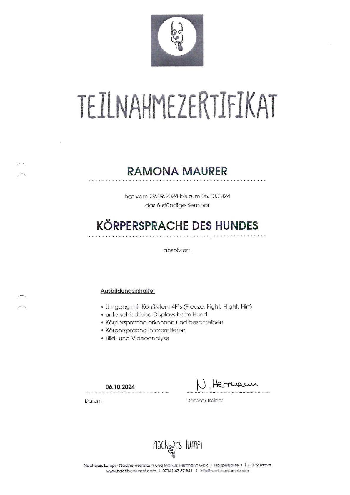 Ich lege großen Wert darauf, mein Wissen ständig zu erweitern. Jede Fortbildung, jedes Seminar und jedes Zertifikat hilft mir, euch und eure Hunde noch besser zu begleiten.