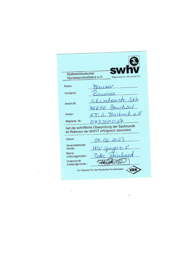 2023 Schriftliche Überprüfung Sachkunde im Rahmen des BH/VT in Speyer