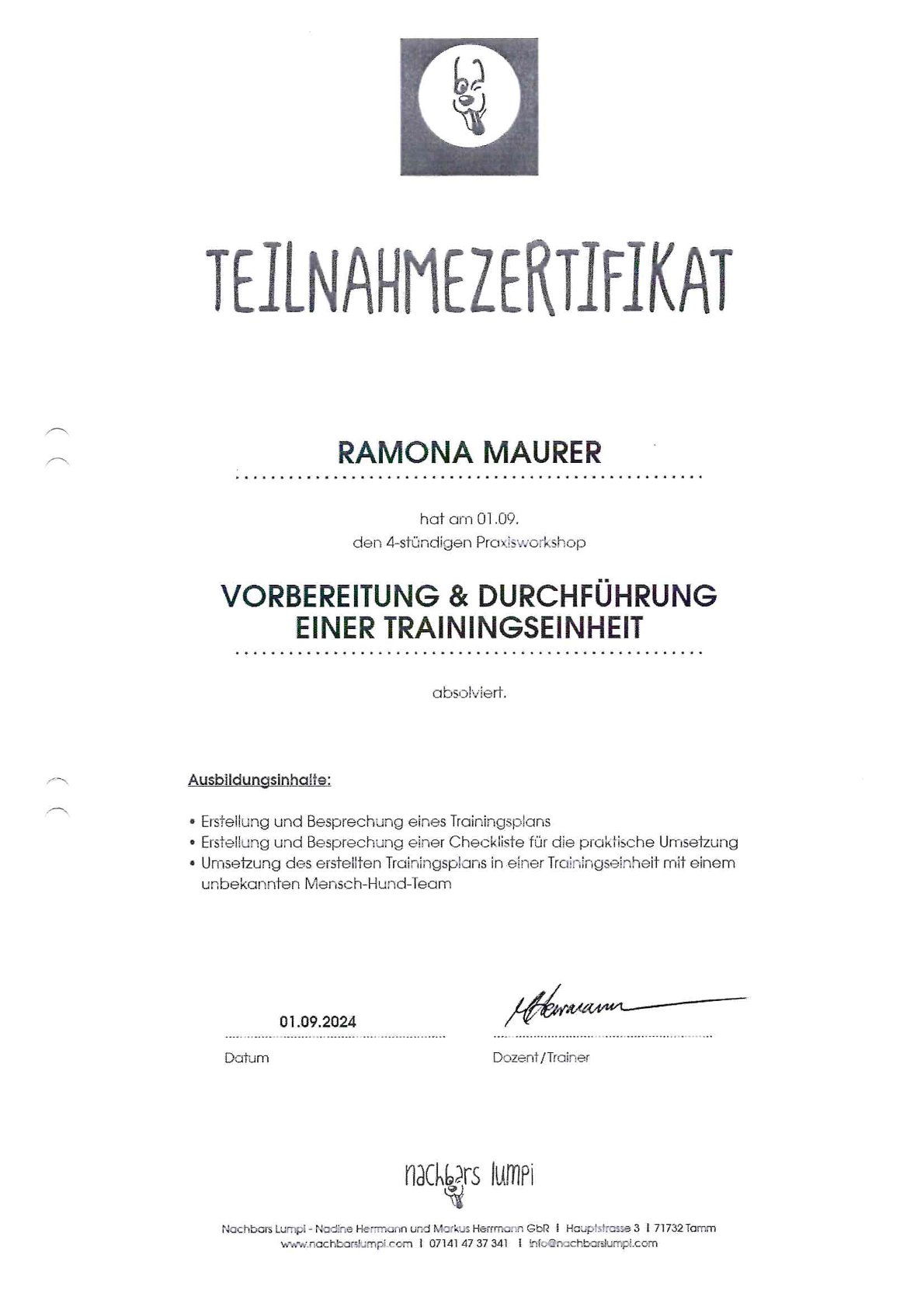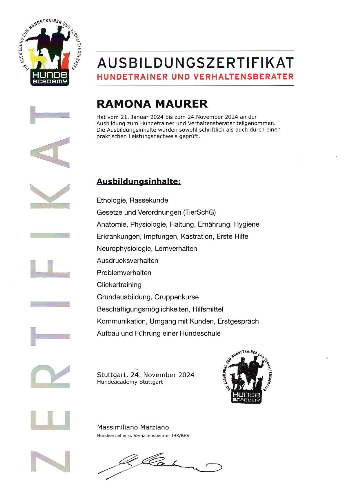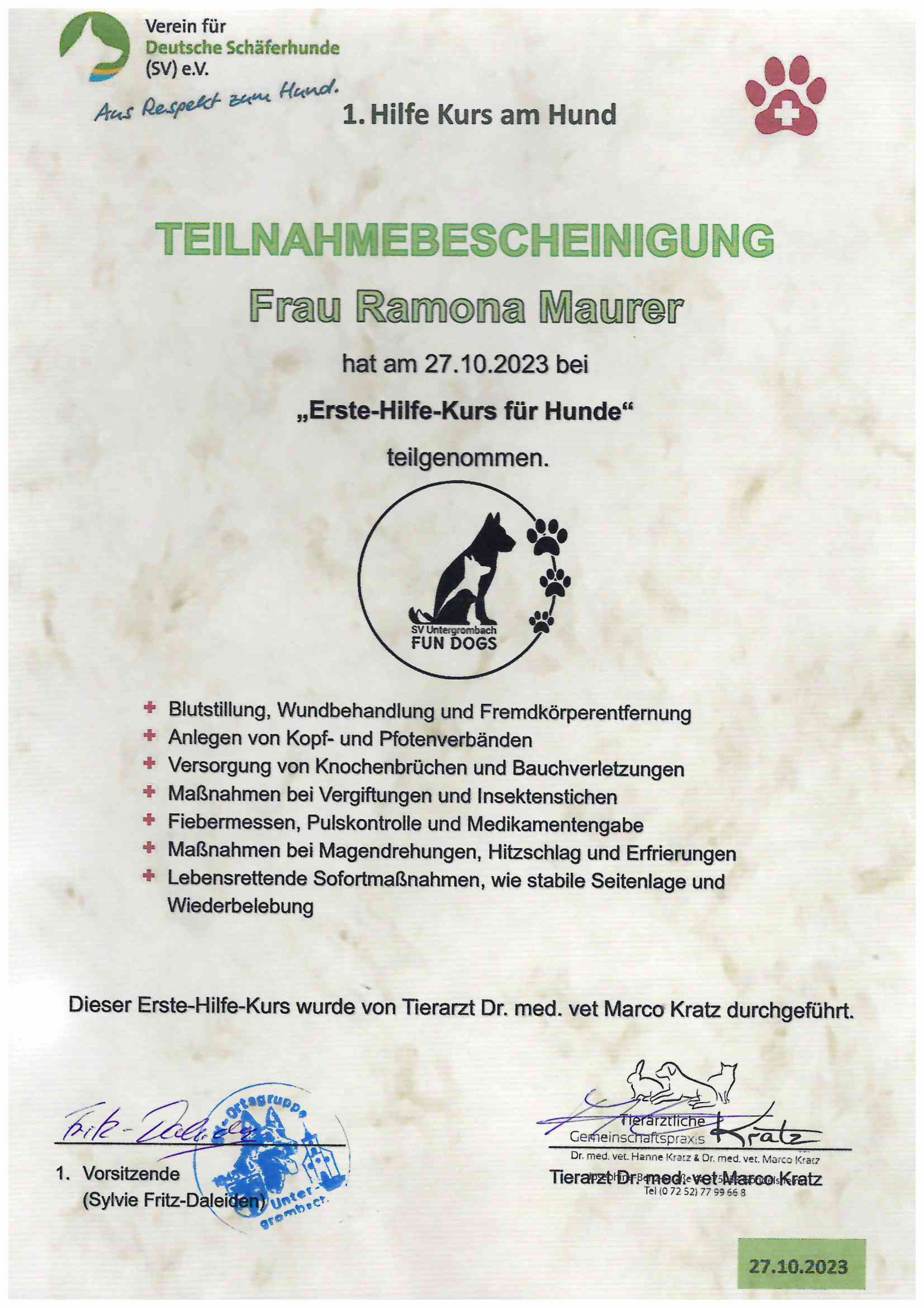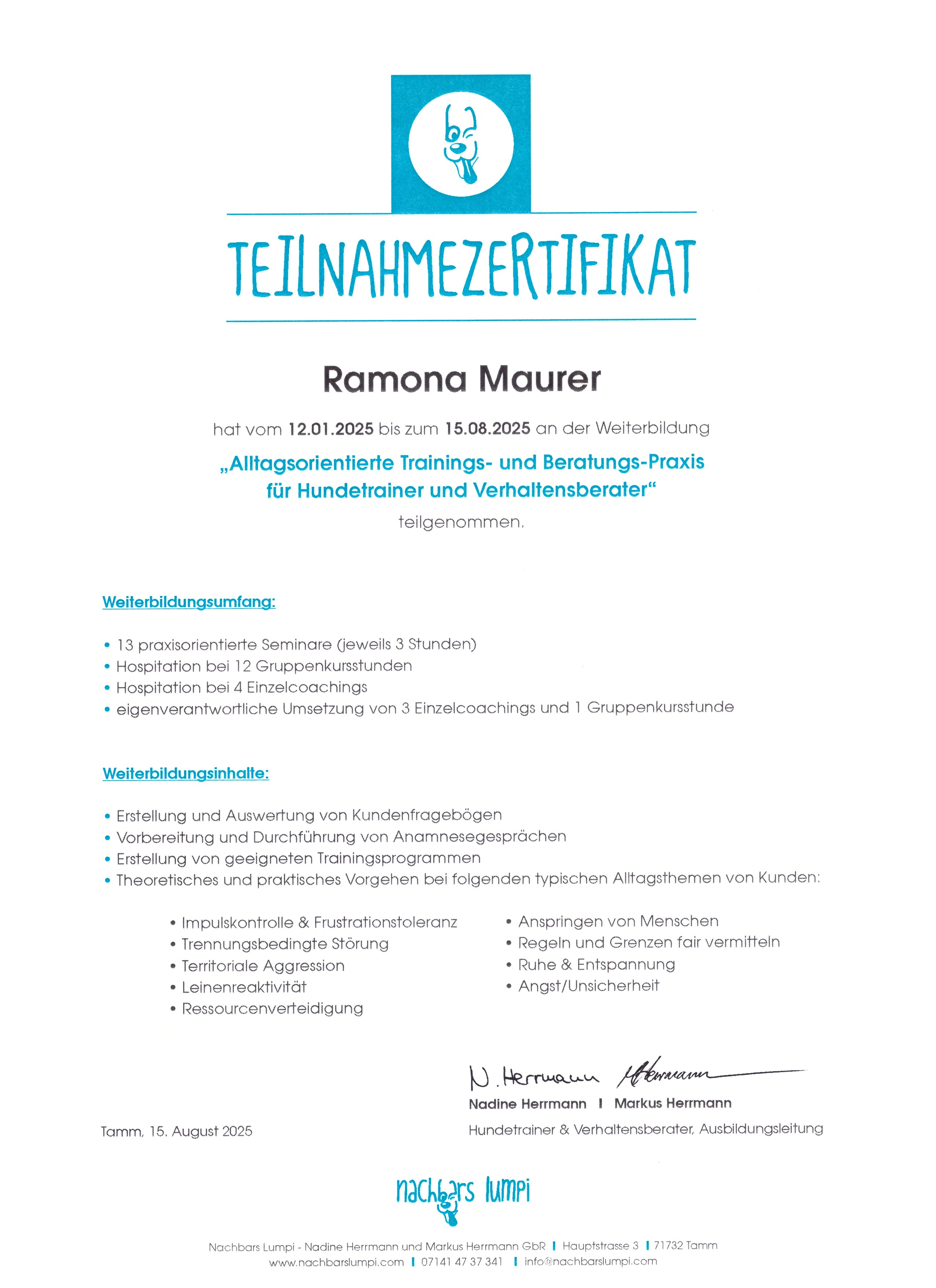 Ich lege großen Wert darauf, mein Wissen ständig zu erweitern. Jede Fortbildung, jedes Seminar und jedes Zertifikat hilft mir, euch und eure Hunde noch besser zu begleiten.